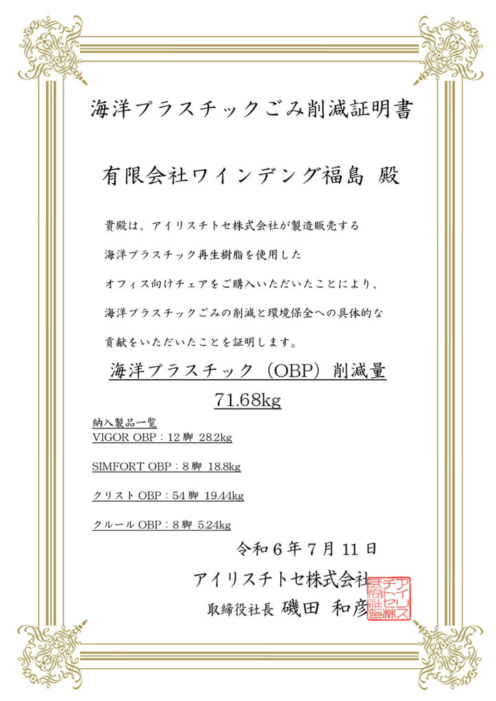 - 海洋プラスチック再生樹脂を採用したオフィスチェアの導入等、リサイクル製品を優先的に購入しております。